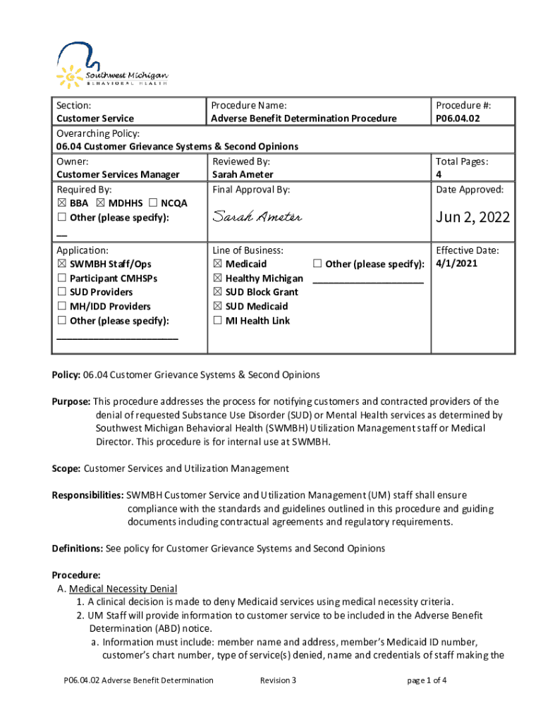 Section: Procedure Name: Customer Service Adverse Benefit Determination Procedure Overarching Policy: 06.04 Customer Grievance Systems & Second Opinions Owner: Reviewed By: Customer Services Manager
