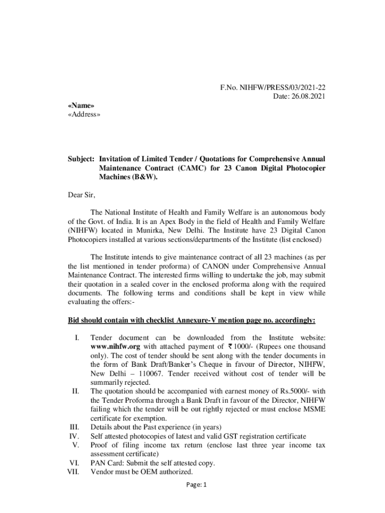 F. No. NOHOW/PRESS/03/202122 Date: 26.08.2021 Name AddressSubject: Invitation of Limited Tender / Quotations for Comprehensive Annual Maintenance Contract (CAME) for 23 Canon Digital Photocopier Machines