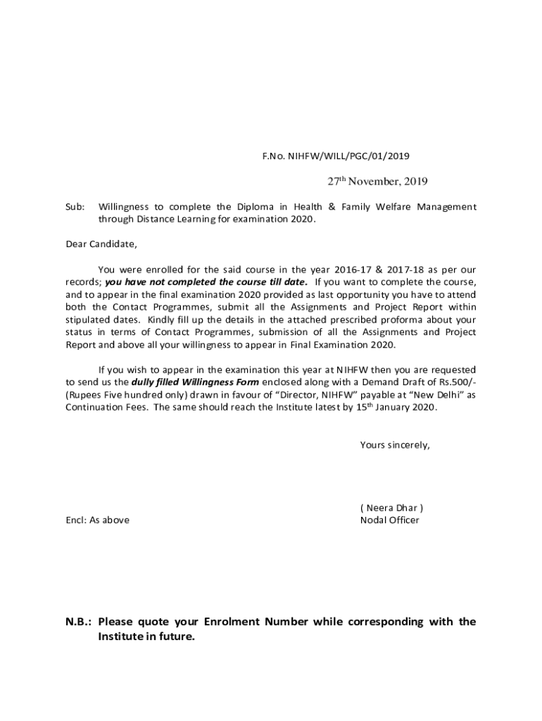 F. No. NOHOW/WILL/PGC/01/201927th November 2019 Sub:Willingness to complete the Diploma in Health & Family Welfare Management through Distance Learning for examination 2020. Dear Candidate, You were