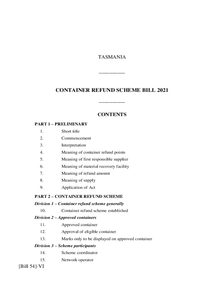 TASMANIA ___CONTAINER REFUND SCHEME BILL 2021 ___ CONTENTS PART 1 PRELIMINARY 1. Short title2. Commencement3. Interpretation4. Meaning of container refund points5. Meaning of first responsible supplier6.