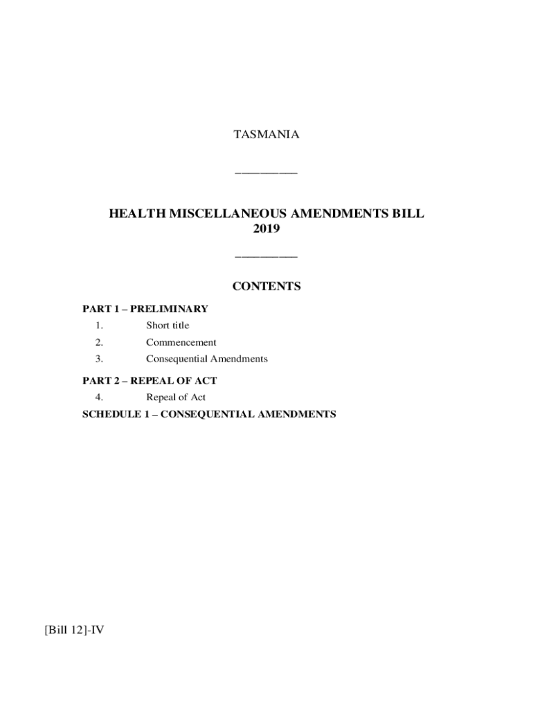 TASMANIA ___HEALTH MISCELLANEOUS AMENDMENTS BILL 2019 ___ CONTENTS PART 1 PRELIMINARY 1. Short title2. Commencement3. Consequential AmendmentsPART 2 REPEAL OF ACT 4. Repeal of Schedule 1 CONSEQUENTIAL