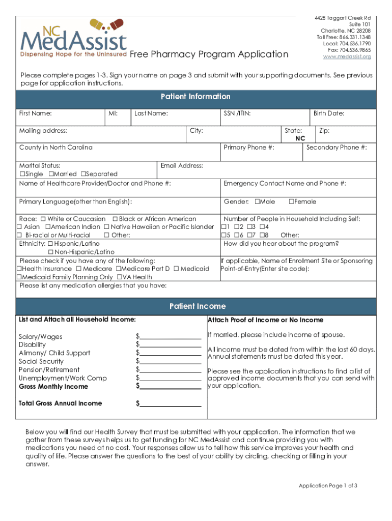 Contact us: Monday Friday 8:00am4:30pm Local: 7045361790 Toll Free: 8663311348 Fax: 7045369865 Email: info@medassist.org www.medassist.orgFree Pharmacy Program Application Instructions Thank you for