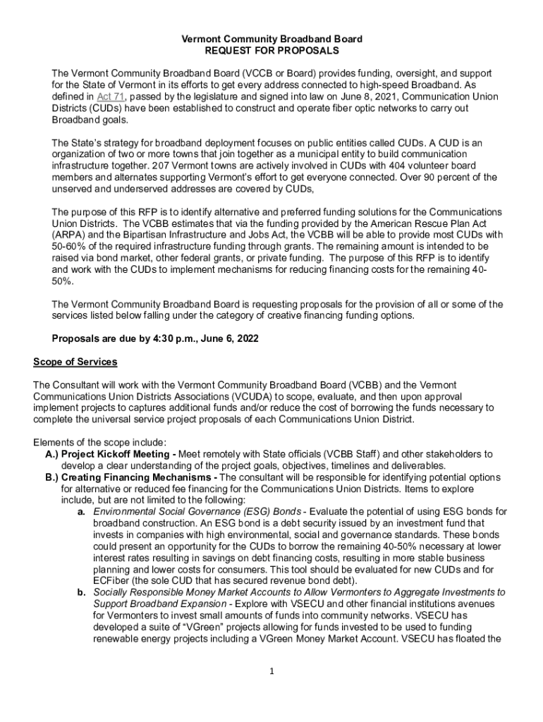 Vermont Community Broadband Board REQUEST FOR PROPOSALS The Vermont Community Broadband Board (CCB or Board) provides funding, oversight, and support for the State of Vermont in its efforts to get