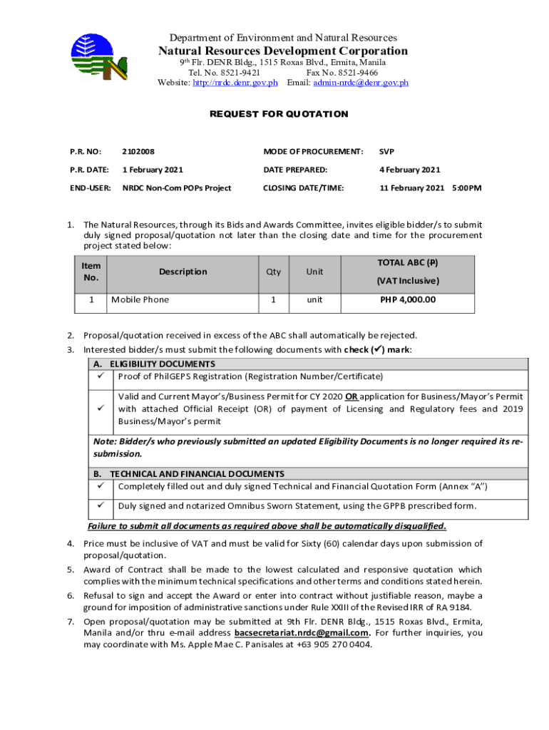 Department of Environment and Natural ResourcesNatural Resources Development Corporation 9th FLR. DEER Bldg., 1515 Rojas Blvd., Ermina, Manila Tel. No. 85219421 Fax No. 85219466 Website: http://nrdc.denr.gov.ph