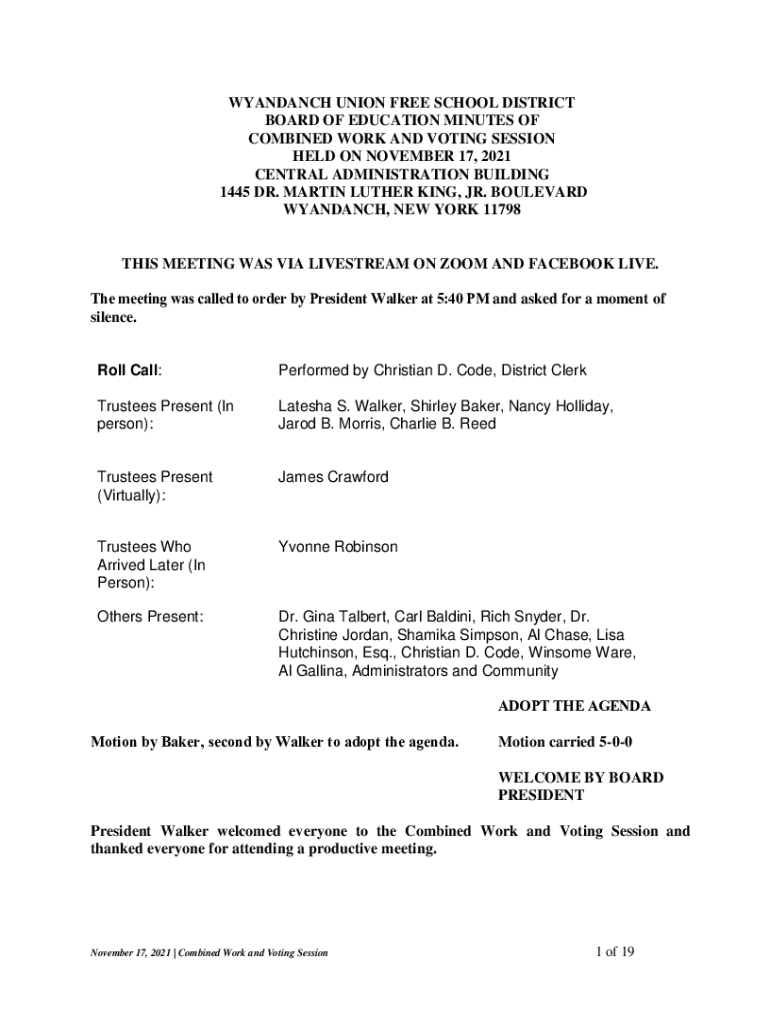 WYANDANCH UNION FREE SCHOOL DISTRICT BOARD OF EDUCATION MINUTES OF COMBINED WORK AND VOTING SESSION HELD ON NOVEMBER 17, 2021, CENTRAL ADMINISTRATION BUILDING 1445 DR. MARTIN LUTHER KING, JR. BOULEVARD
