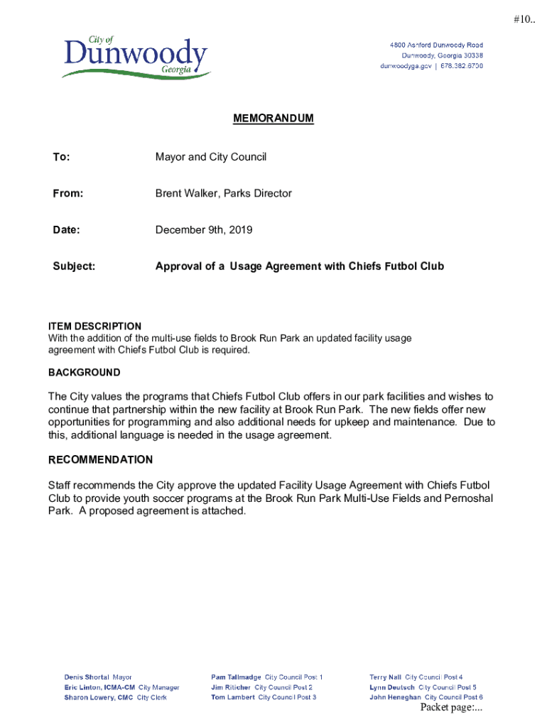 #10.MEMORANDUM To:Mayor and City Councilor:Brent Walker, Parks Directorate:December 9th, 2019Subject:Approval of a Usage Agreement with Chiefs Futon Cluster DESCRIPTION With the addition of the multiuse