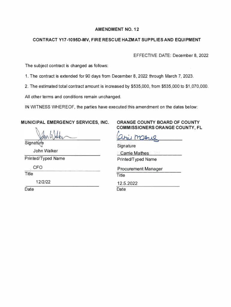 AMENDMENT NO. 12 CONTRACT Y171095DMV, FIRE RESCUE HAZMAT SUPPLIES AND EQUIPMENT EFFECTIVE DATE: December 8, 2022, The subject contract is changed as follows: 1. The contract is extended for 90 days