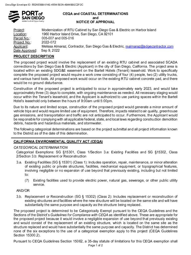 DocuSign Envelope ID: 892A93BB514E49049E0A4B445BEC2FDCCEQA and COASTAL DETERMINATIONS and NOTICE OF APPROVAL Project: Location: Parcel No.: Project No.: Applicant: Date Approved:Modernization of RTU