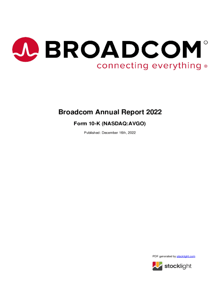 Broadcom Annual Report 2022 Form 10K (NASDAQ:AGO) Published: December 16th, 2022PDF generated by stock light. Counted STATES SECURITIES AND EXCHANGE COMMISSION Washington, DC 20549 Form 10K (MARK
