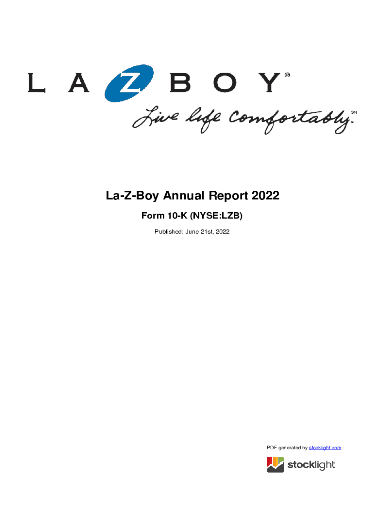 Labor Annual Report 2022 Form 10K (NYSE:LZB) Published: June 21st, 2022PDF generated by stock light. Counted STATES SECURITIES AND EXCHANGE COMMISSION Washington, D.C. 20549FORM 10K (Mark One)ANNUAL