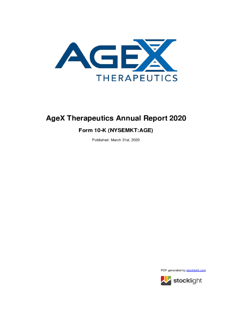 Age Therapeutics Annual Report 2020 Form 10K (NYSE MKT:AGE) Published: March 31st, 2020PDF generated by stock light. Counted STATES SECURITIES AND EXCHANGE COMMISSION Washington, D.C. 20549FORM 10K/A1