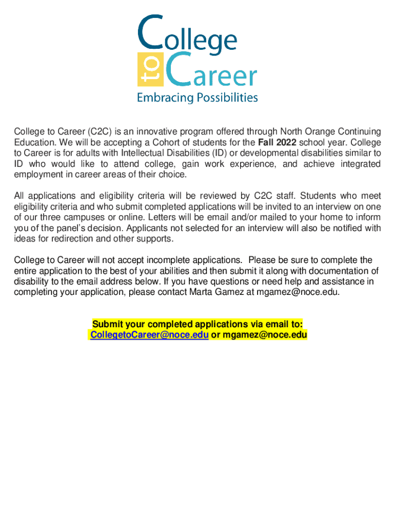 College to Career (C2C) is an innovative program offered through North Orange Continuing Education. We will be accepting a Cohort of students for the Fall 2022 school year. College to Career is for