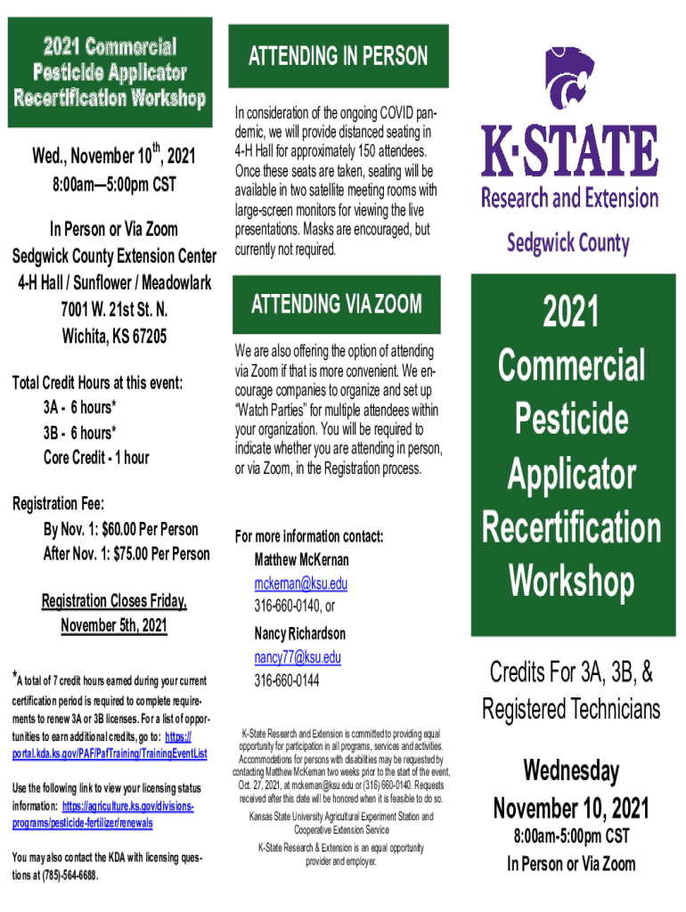 2021 Commercial Pesticide Applicator Recertification Workshop Wed., November 10th, 2021 8:00am5:00pm CST In Person or Via Zoom Sedgwick County Extension Center 4H Hall / Sunflower / Meadowlark 7001