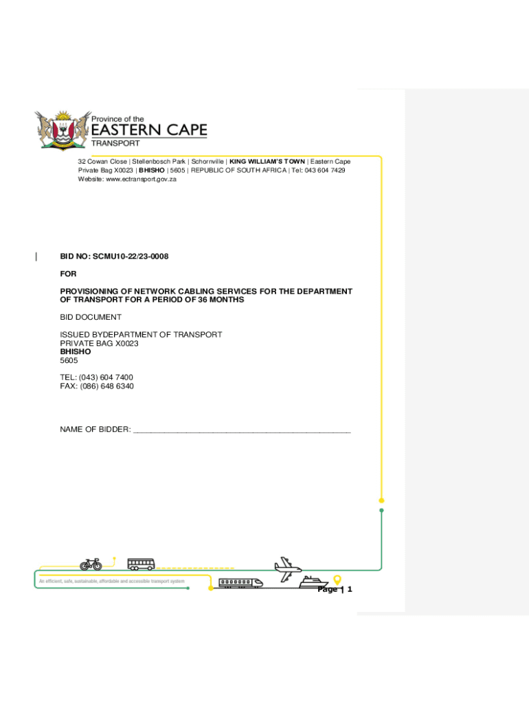 32 Conan Close | Stellenbosch Park | Corneille | KING WILLIAMS TOWN | Eastern Cape Private Bag X0023 | BISHOP | 5605 | REPUBLIC OF SOUTH AFRICA | Tel: 043 604 7429 Website: www.ectransport.gov.zaBID