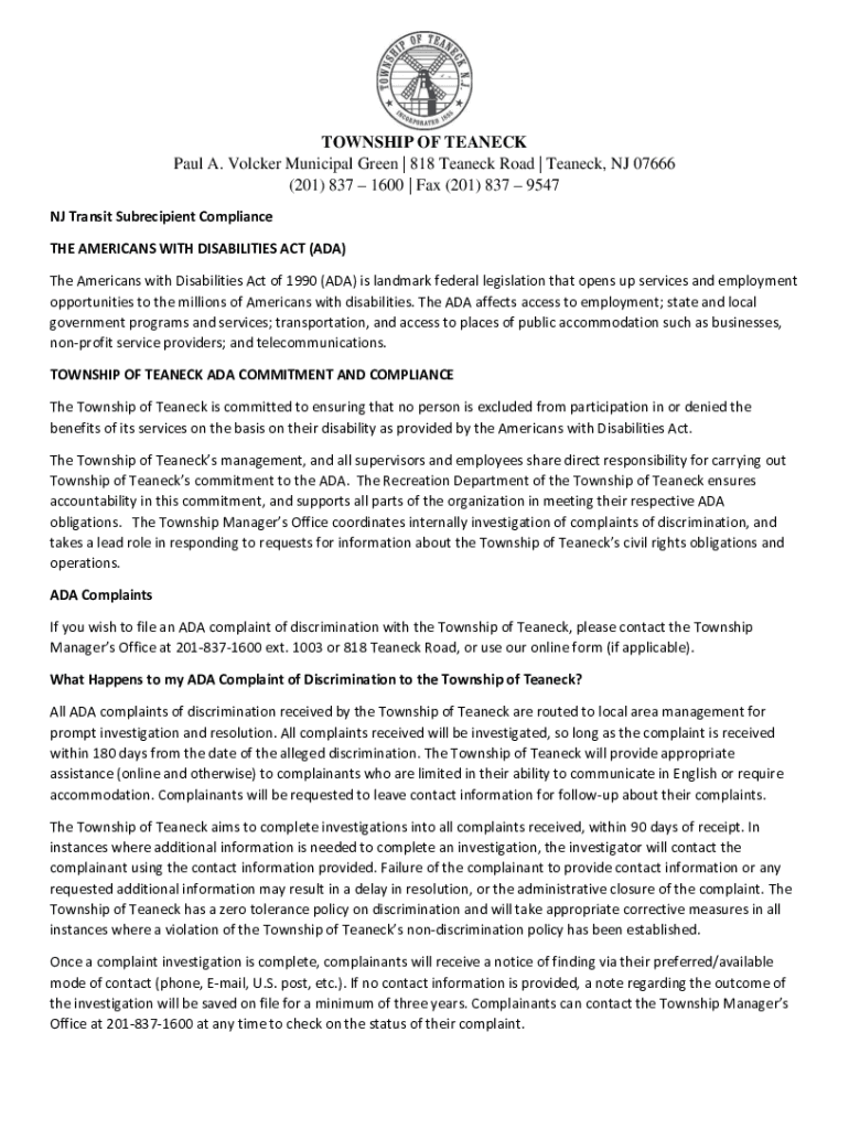 TOWNSHIP OF REDNECK Paul A. Volcker Municipal Green | 818 Tea neck Road | Tea neck, NJ 07666 (201) 837 1600 | Fax (201) 837 9547 NJ Transit Subrecipient Compliance THE AMERICANS WITH DISABILITIES