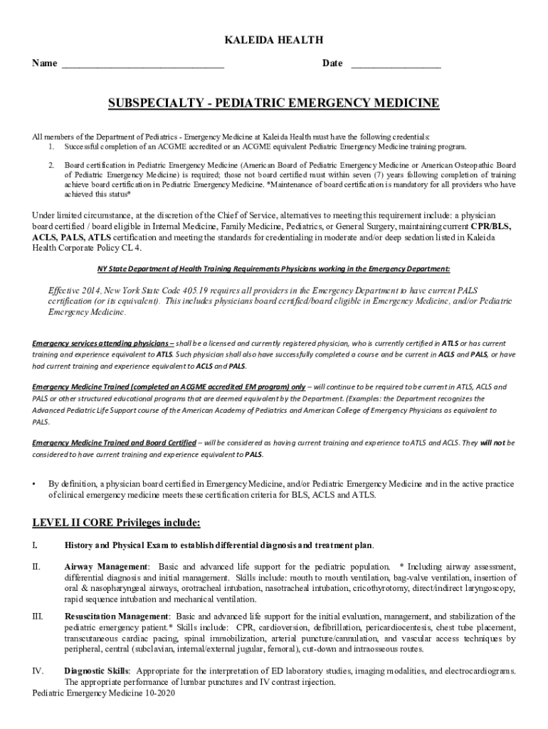ALMEIDA HEALTH Name ___Date ___SUBSPECIALTY PEDIATRIC EMERGENCY MEDICINE All members of the Department of Pediatrics Emergency Medicine at Canada Health must have the following credentials: 1. Successful