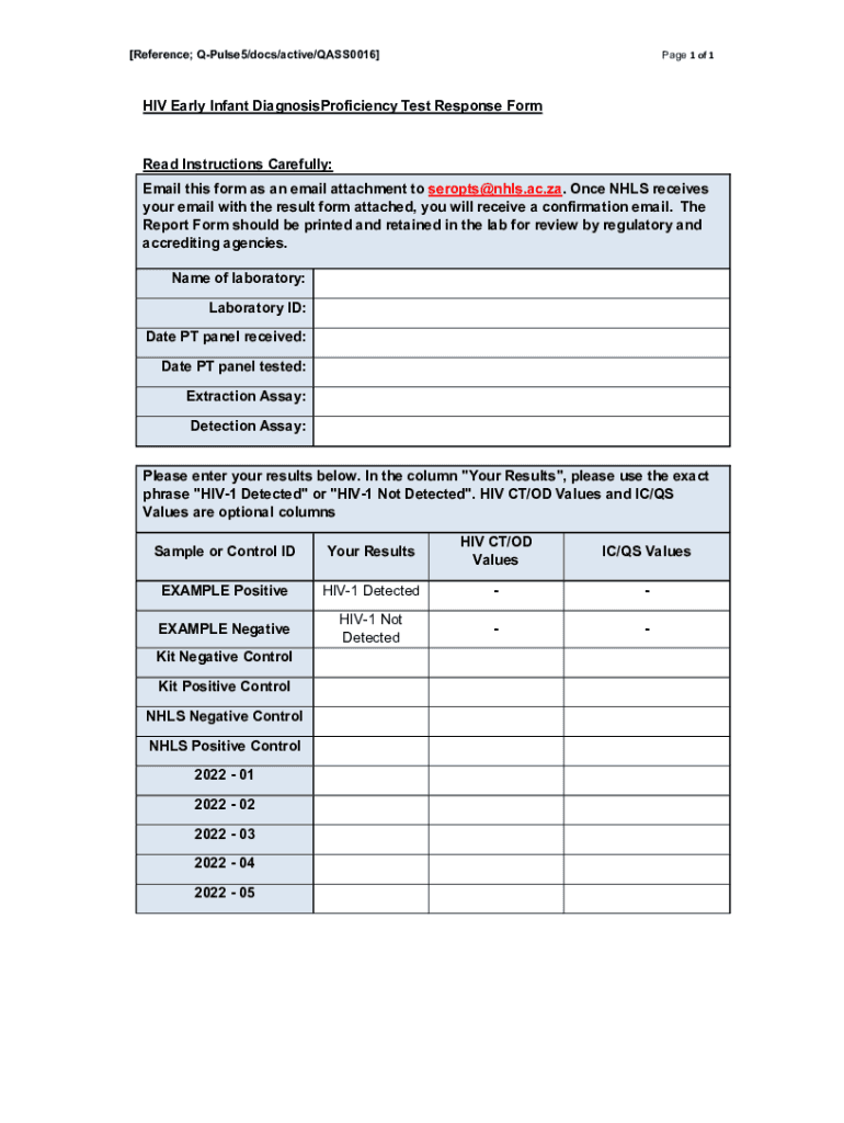 [Reference; QPulse5/docs/active/QASS0016]Page 1 of 1HIV Early Infant DiagnosisProficiency Test Response Formed Instructions Carefully: Email this form as an email attachment to seropts@nhls.ac.za.