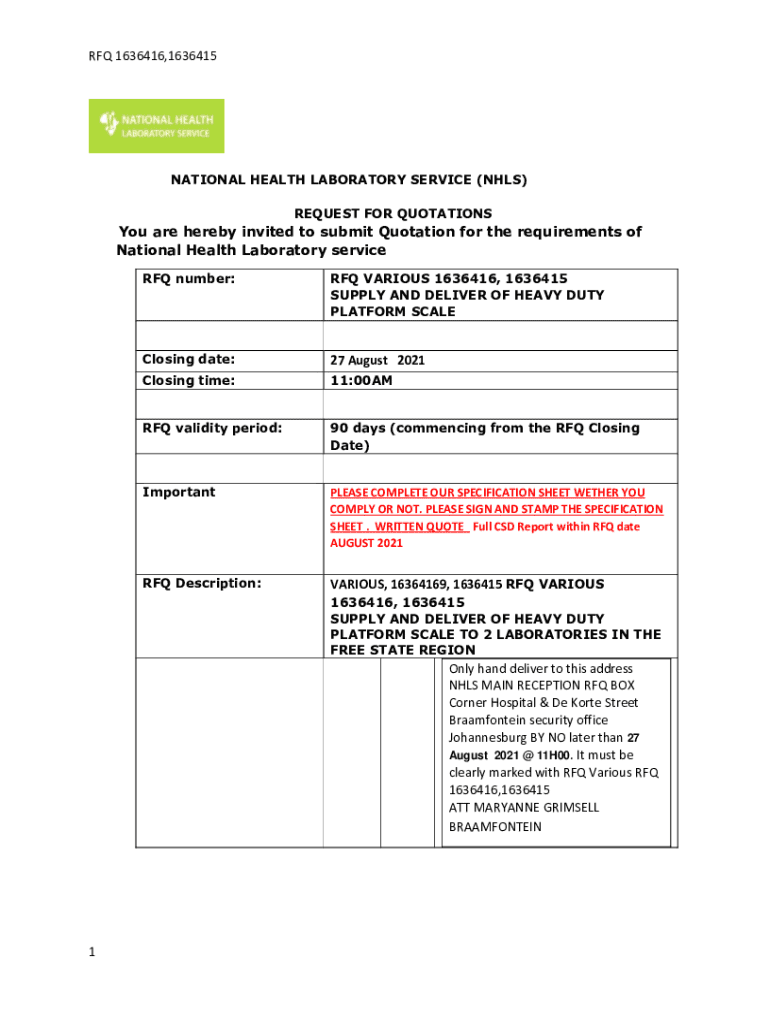 RFQ 1636416,1636415NATIONAL HEALTH LABORATORY SERVICE (NHS) REQUEST FOR Quotations are hereby invited to submit Quotation for the requirements of National Health Laboratory service RFQ number:RFQ