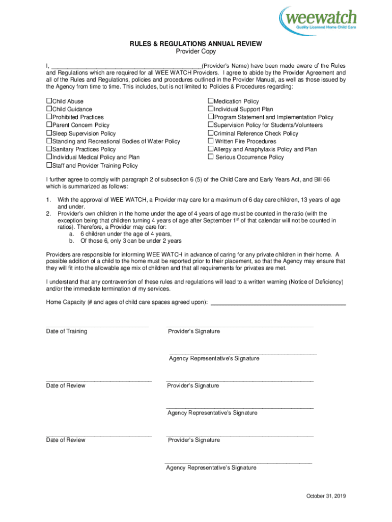 RULES & REGULATIONS ANNUAL REVIEW Provider Copy I, ___(Providers Name) have been made aware of the Rules and Regulations which are required for all WEE WATCH Providers. I agree to abide by the Provider