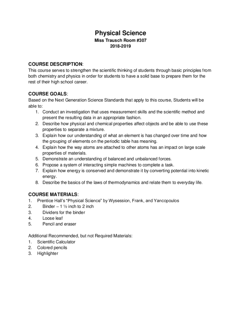Physical Science Miss Trash Room #307 20182019COURSE DESCRIPTION: This course serves to strengthen the scientific thinking of students through basic principles from both chemistry and physics in order