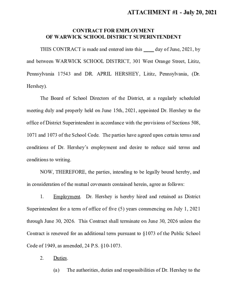 ATTACHMENT #1 July 20, 2021, CONTRACT FOR EMPLOYMENT OF WARWICK SCHOOL DISTRICT SUPERINTENDENT THIS CONTRACT is made and entered into this ___ day of June 2021, by and between WARWICK SCHOOL DISTRICT,