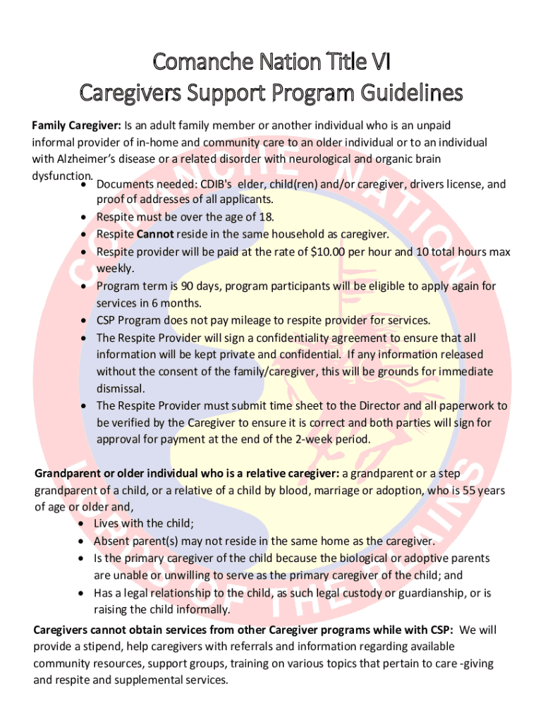 Comanche Nation Title VI Caregivers Support Program Guidelines Family Caregiver: Is an adult family member or another individual who is an unpaid informal provider of income and community care to
