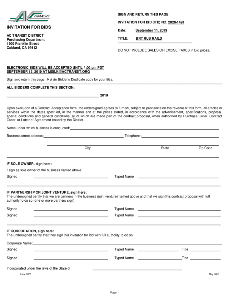 SIGN AND RETURN THIS PAGE INVITATION FOR BID (IF) NO. 20201491INVITATION FOR BIDS AC TRANSIT DISTRICT Purchasing Department 1600 Franklin Street Oakland, CA 94612Date:September 11, 2019TITLE:BRT RUB