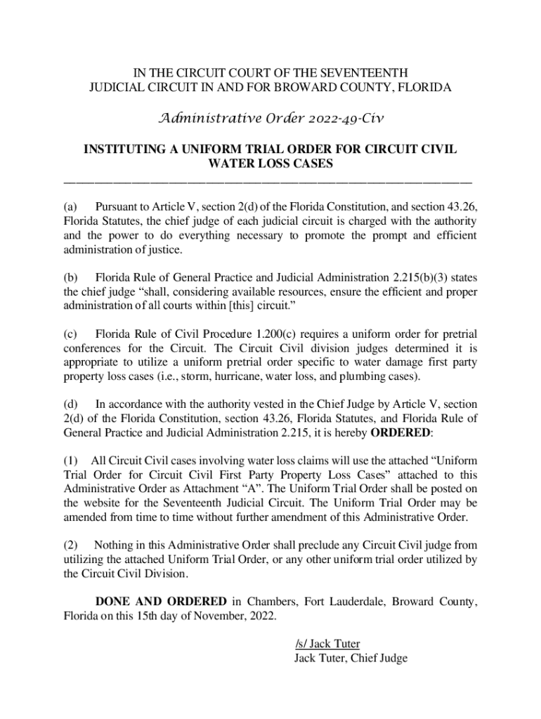 IN THE CIRCUIT COURT OF THE SEVENTEENTH JUDICIAL CIRCUIT IN AND FOR BROWARD COUNTY, FLORIDA Administrative Order 202249Civ INSTITUTING A UNIFORM TRIAL ORDER FOR CIRCUIT CIVIL WATER LOSS CASES ___