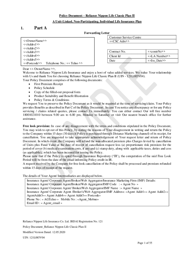 Get the free Policy DocumentReliance Nippon Life Prosperity Plus