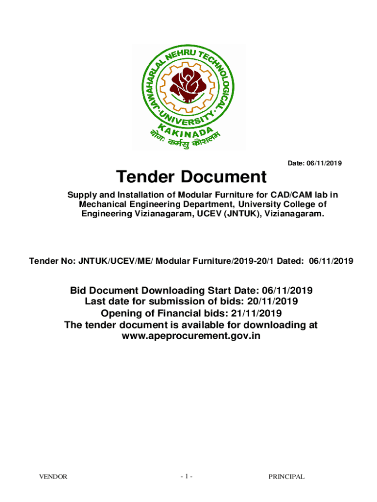Date: 06/11/2019Tender Document Supply and Installation of Modular Furniture for CAD/CAM lab in Mechanical Engineering Department, University College of Engineering Vizianagaram, CEV (JNT UK), Vizianagaram.