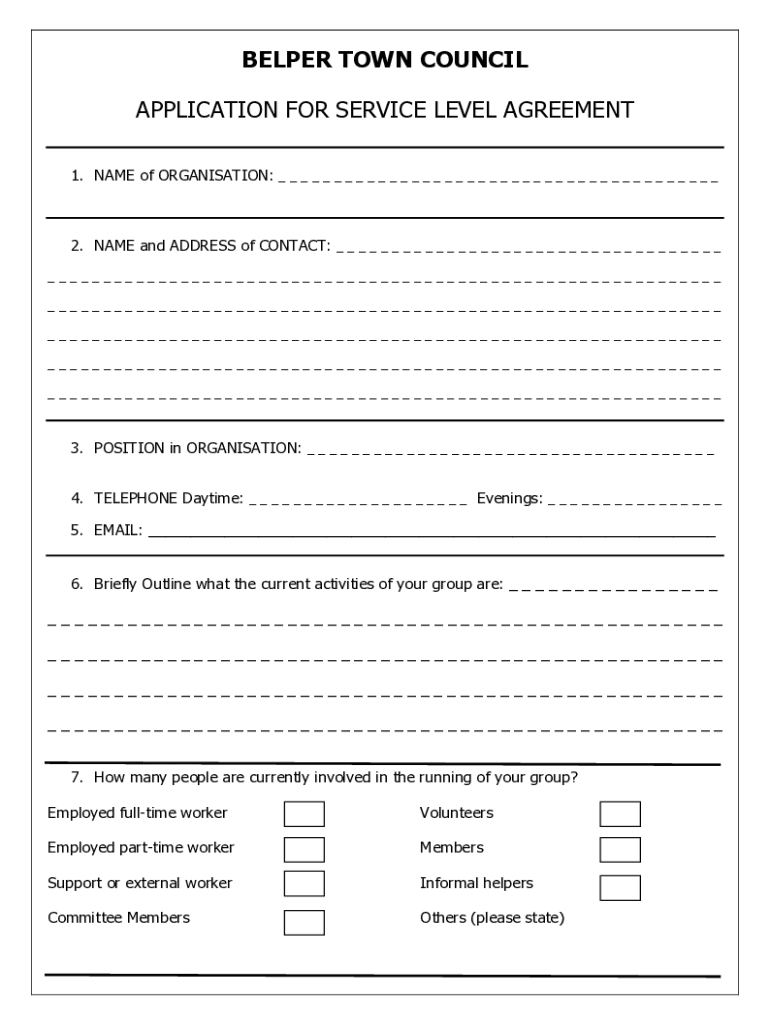 HELPER TOWN COUNCIL APPLICATION FOR SERVICE LEVEL AGREEMENT 1. NAME of Organization: _ _ _ _ _ _ _ _ _ _ _ _ _ _ _ _ _ _ _ _ _ _ _ _ _ _ _ _ _ _ _ _ _ _ _ _ _ _ _ _2. NAME and ADDRESS of CONTACT: