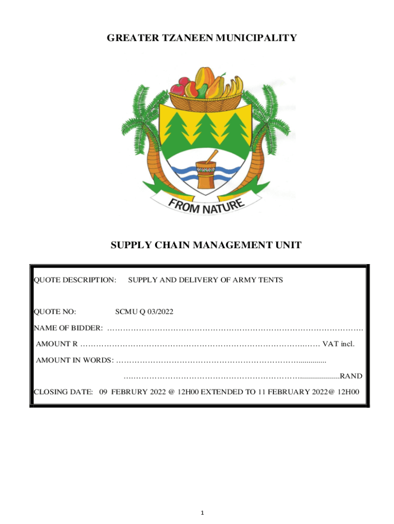 GREATER TAKEN MUNICIPALITYSUPPLY CHAIN MANAGEMENT UNQUOTE DESCRIPTION:QUOTE NO:SUPPLY AND DELIVERY OF ARMY TENTSSCMU Q 03/2022NAME OF BIDDER:. AMOUNT R. VAT incl. AMOUNT IN WORDS: ...............