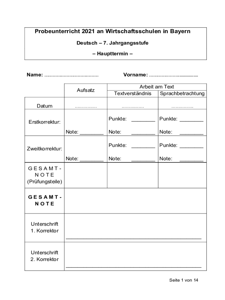 Probeunterricht 2021 a Wirtschaftsschulen in Bayern Deutsche 7. Jahrgangsstufe Haupttermin Name: Ansatz Datum Erstkorrektur:Surname: ................. Albeit am Text Textverstndnis Sprachbetrachtung.