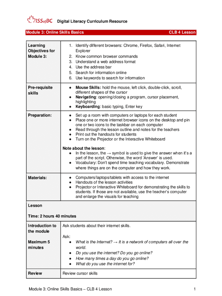 Digital Literacy Curriculum Resource Module 3: Online Skills Basics CLB 4 LessonLearning Objectives for Module 3:1. Identify different browsers: Chrome, Firefox, Safari, Internet Explorer 2. Know
