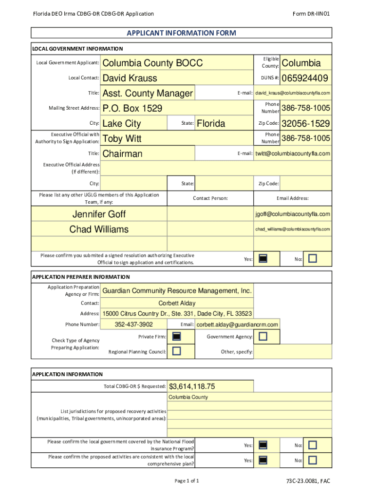 FloridaDEOIrma CDBGDRCDBGDRApplicationForm DRIIN01APPLICANTINFORMATIONFORM