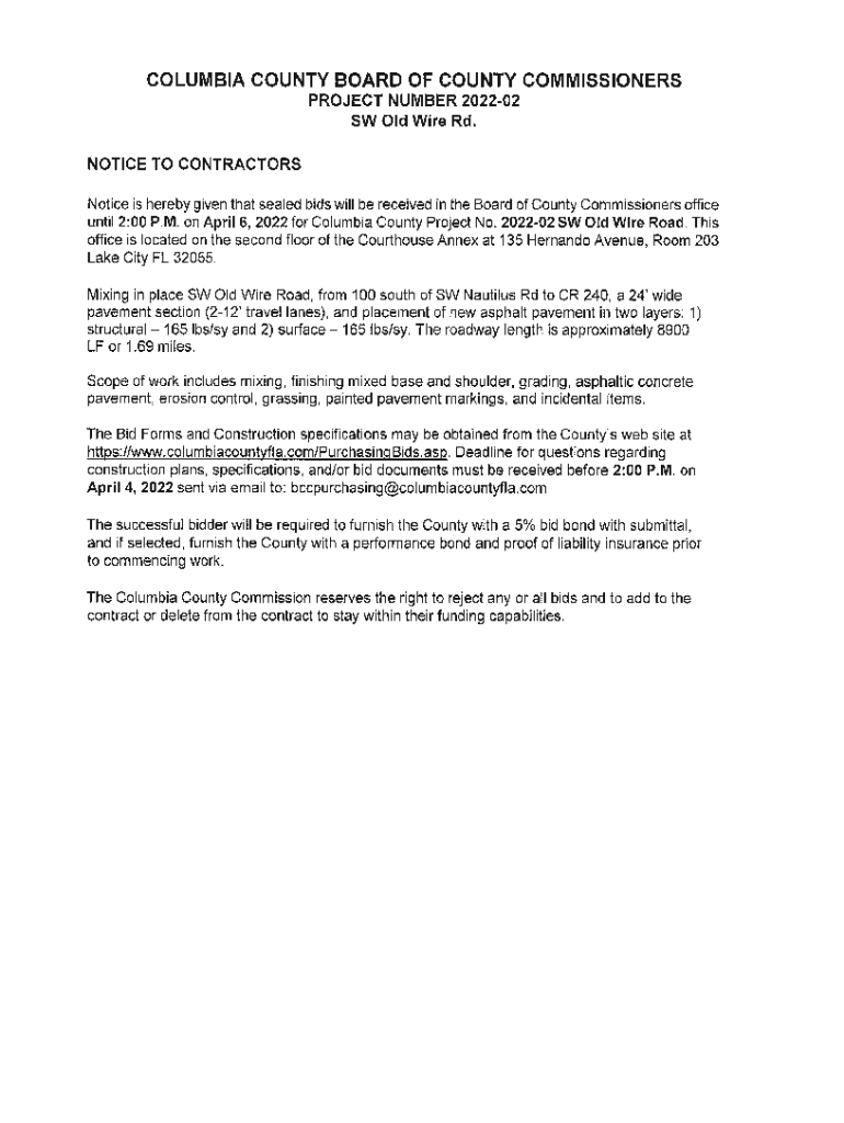 COLUMBIA COUNTY BOARD OF COUNTY COMMISSIONERS PROJECT NUMBER 202202 SW Old Wire Rd. NOTICE TO CONTRACTORS Notice is hereby given that sealed bids will be received in the Board of County Commissioners'