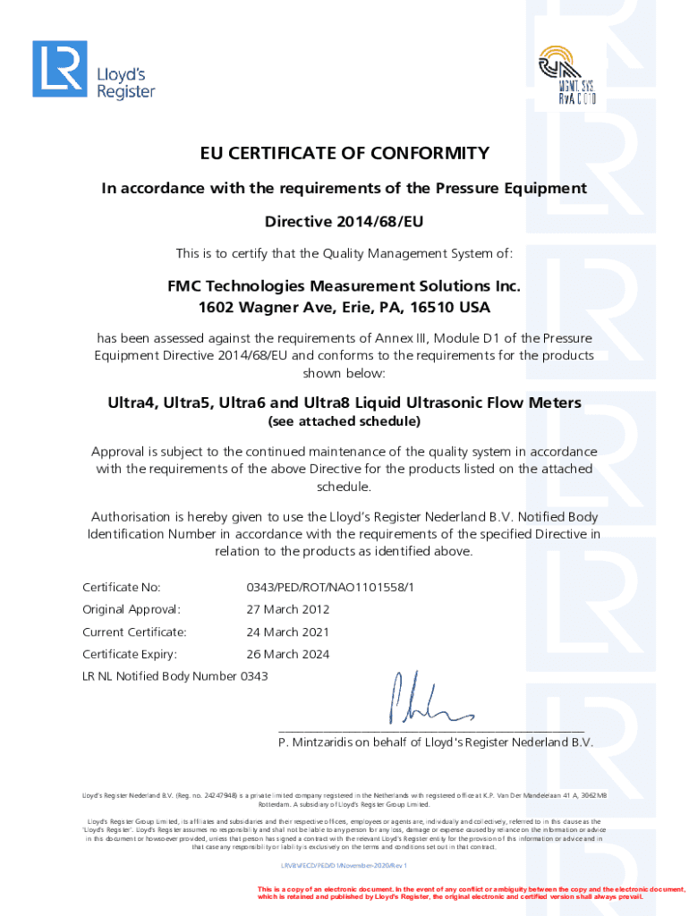 EU CERTIFICATE OF CONFORMITY In accordance with the requirements of the Pressure Equipment Directive 2014/68/EU This is to certify that the Quality Management System of:FMC Technologies Measurement