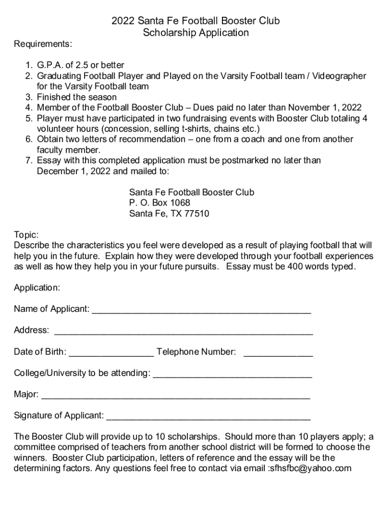 2022 Santa Fe Football Booster Club Scholarship Application Requirements: 1. G.P.A. of 2.5 or better 2. Graduating Football Player and Played on the Varsity Football team / Videographer for the Varsity