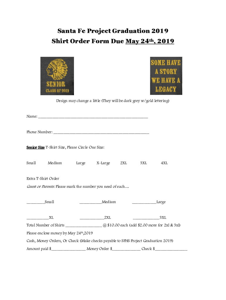 Santa Fe Project Graduation 2019 Shirt Order Form Due May 24th, 2019Design may change a little (They will be dark gray w/gold lettering)Name: ___Phone Number: ___Senior Size Shirt Size, Please Circle