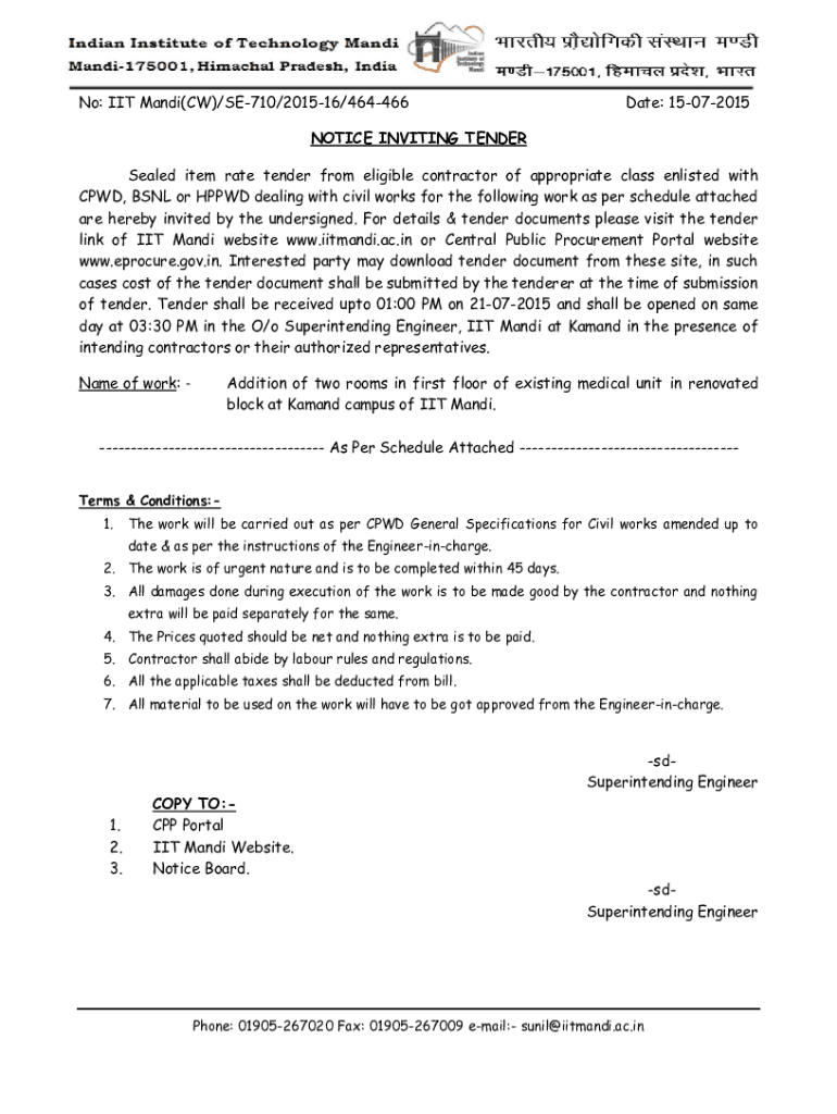 No: IIT Mandy(CW)/SE710/201516/464466Date: 15072015NOTICE INVITING TENDER Sealed item rate tender from eligible contractor of appropriate class enlisted with CPD, BSNL or HOPED dealing with civil
