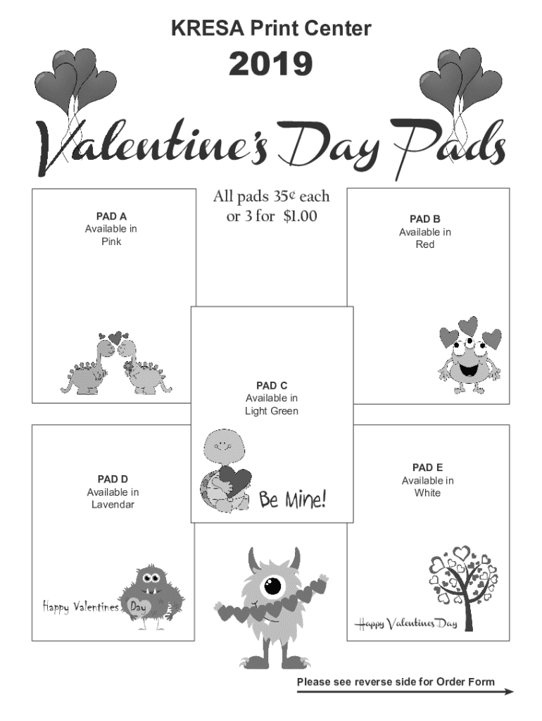 KR ESA Print Center2019Valentines Day Pads PAD A Available in Pinball pads 35 each or 3 for $1.00PAD B Available in Read C Available in Light Greenland D Available in Lavender Mine!PAD E Available