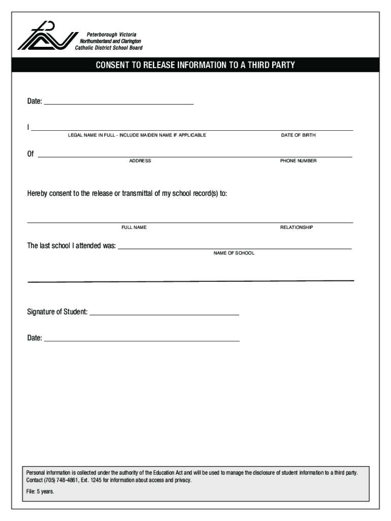 CONSENT TO RELEASE INFORMATION TO A THIRD Partake: ___ I ___ LEGAL NAME IN FULL INCLUDE MAIDEN NAME IF APPLICABLEDATE OF Birth ___ ADDRESSPHONE NUMBERHereby consent to the release or transmittal of