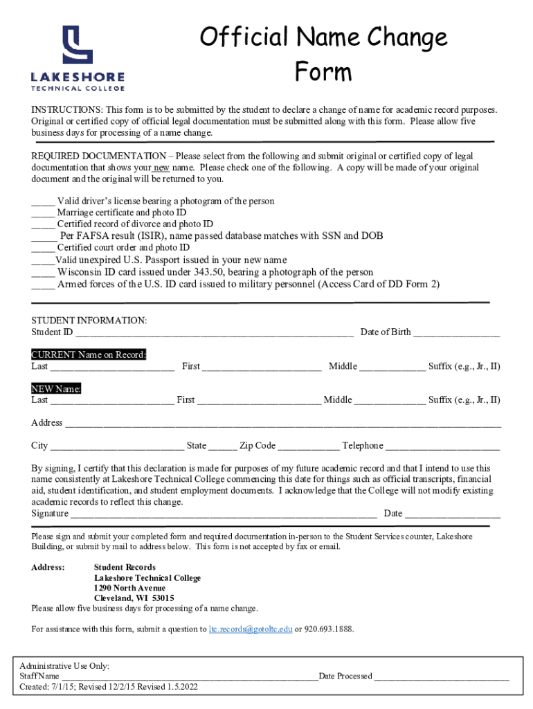 Official Name Change Form INSTRUCTIONS: This form is to be submitted by the student to declare a change of name for academic record purposes. Original or certified copy of official legal documentation