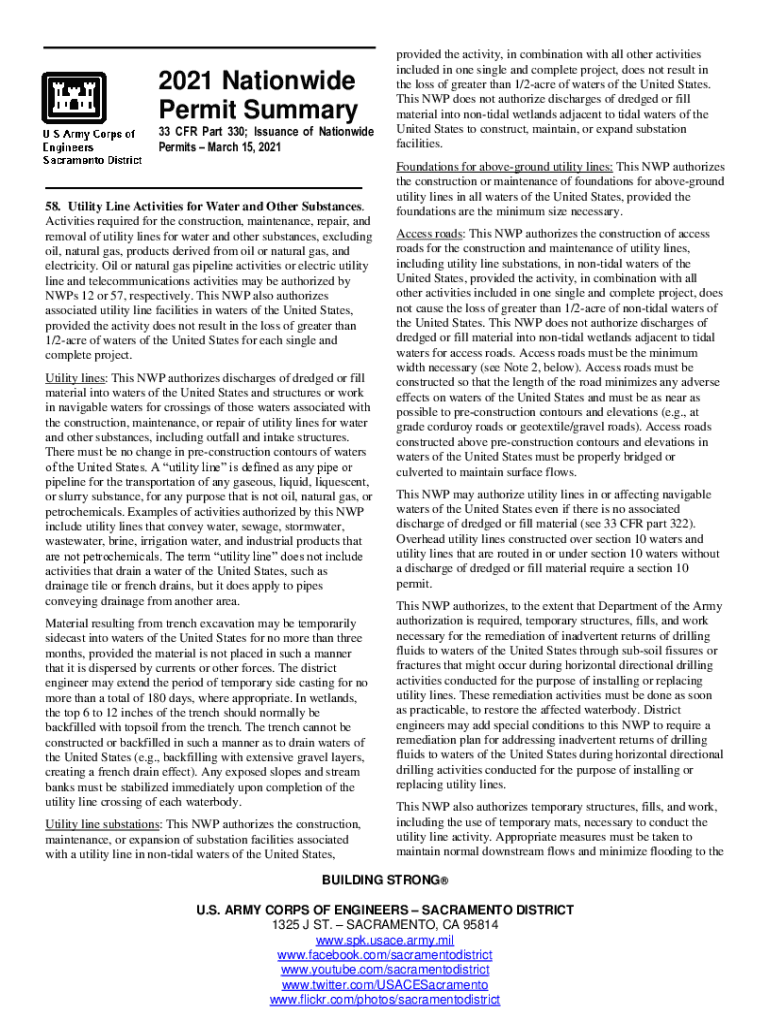 2021 Nationwide Permit Summary 33 CFR Part 330; Issuance of Nationwide Permits March 15, 202158. Utility Line Activities for Water and Other Substances. Activities required for the construction, maintenance,