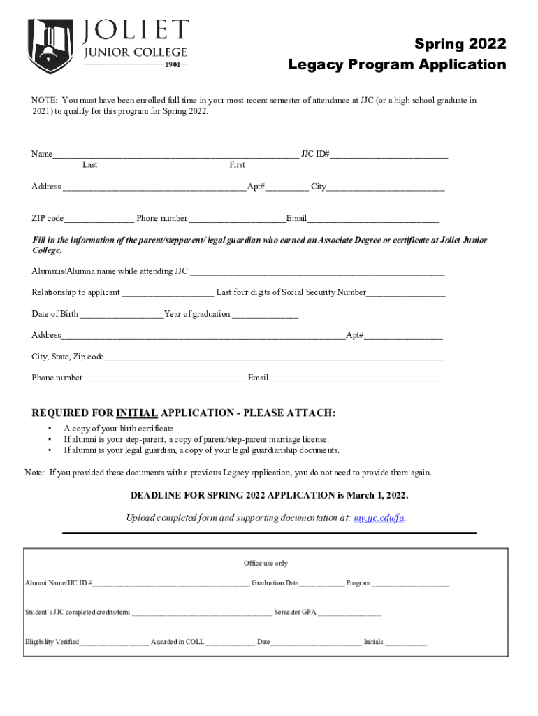 Spring 2022 Legacy Program Application Legacy Program Guidelines for Spring 2022 Eligibility The Joliet Junior College Legacy Program is awarded to the child, stepchild, or legal dependent of a JC