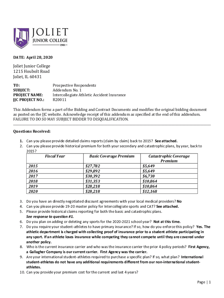 DATE: April 28, 2020Joliet Junior College 1215 Double Road Joliet, IL 60431 TO: SUBJECT: PROJECT NAME: JC Projects NO.:Prospective Respondents Addendum No. 1 Intercollegiate Athletic Accident Insurance