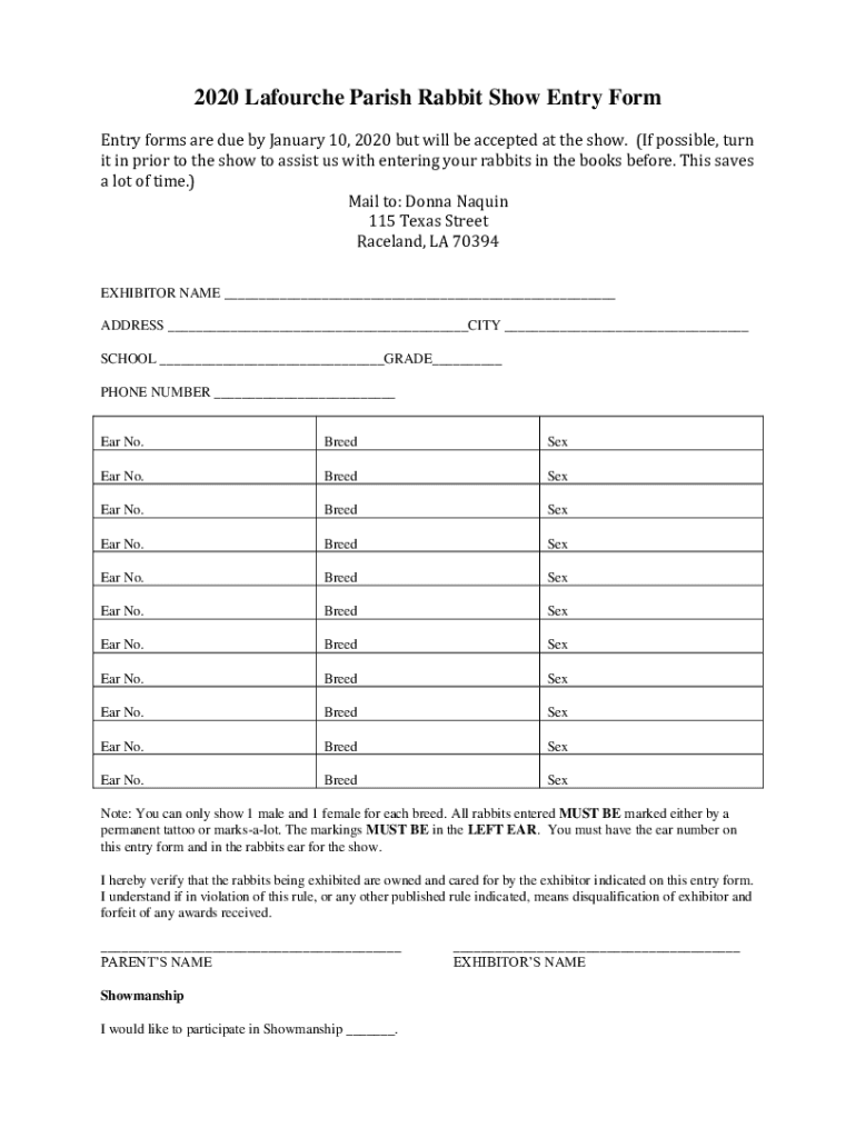 2020 Louche Parish Rabbit Show Entry Form Entry forms are due by January 10, 2020, but will be accepted at the show. (If possible, turn it in prior to the show to assist us with entering your rabbits
