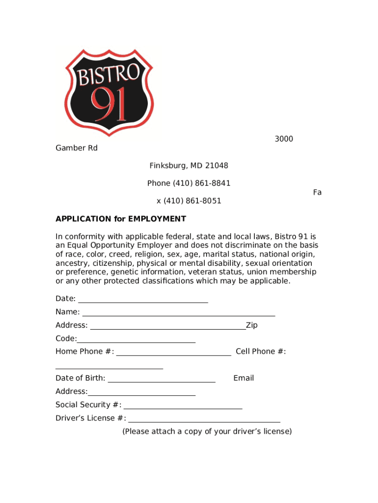 The Employee application template - Bistro 221 is a Word document you can get completed and signed for certain purpose. Next, it is provided to the relevant addressee in order to provide specific information and data. The completion and signing is possible in hard copy or via a trusted application like PDFfiller. These services help to send in any PDF or Word file online. It also lets you edit its appearance according to your requirements and put a valid electronic signature. Once you're good, the user ought to send the Employee application template - Bistro 221 to the recipient or several recipients by email and even fax. PDFfiller provides a feature and options that make your blank printable. It has various options when printing out. It does no matter how you'll deliver a document - physically or by email - it will always look well-designed and firm. To not to create a new editable template from scratch again and again, make the original Word file into a template. Later, you will have a customizable sample.