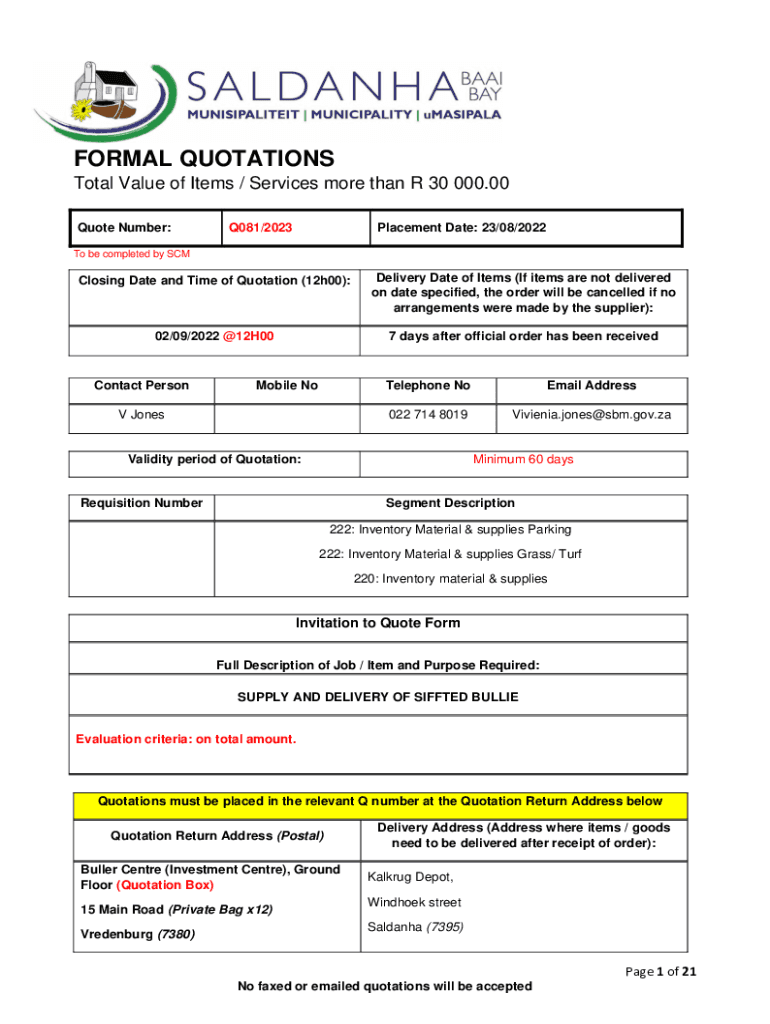 Quote Number:Q081/2023Placement Date: 23/08/2022To be completed by Closing Date and Time of Quotation (12h00):Delivery Date