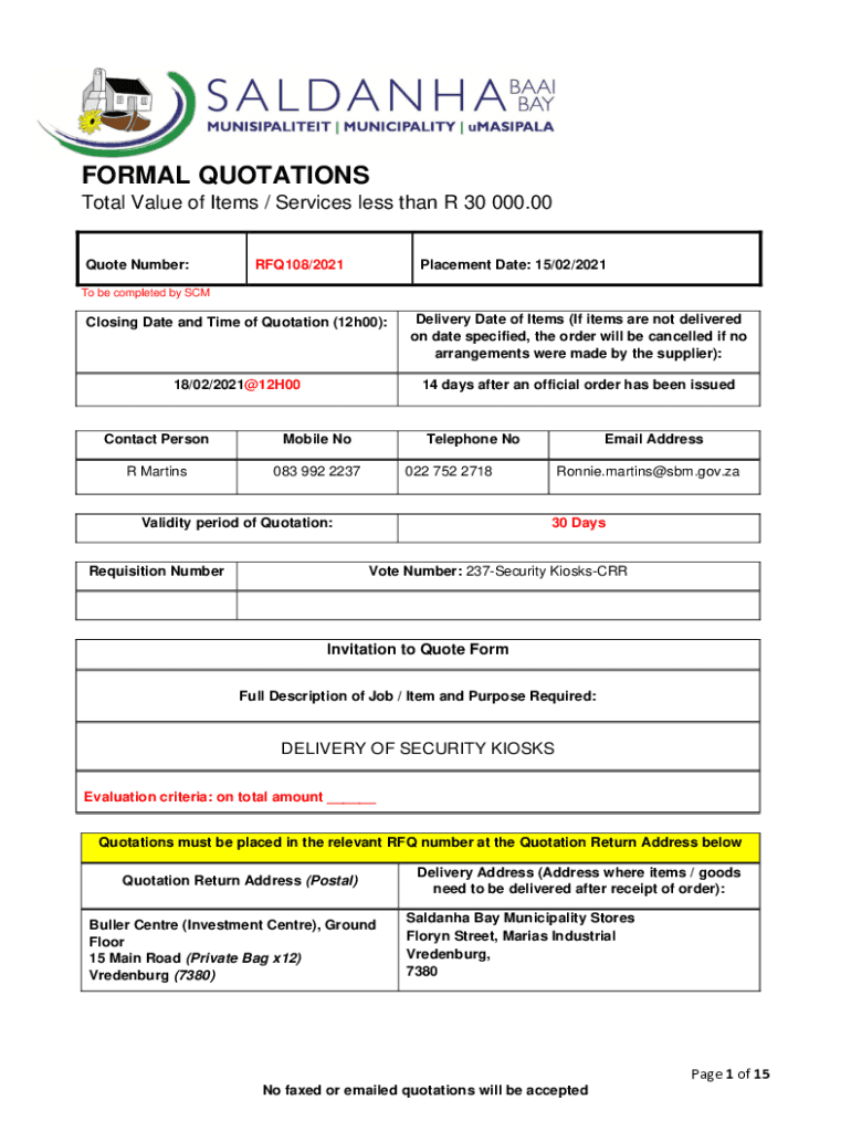 FORMAL QUOTATIONS Total Value of Items / Services less than R 30 000.00 Quote Number:RFQ108/2021Placement Date: 15/02/2021To be completed by Closing Date and Time of Quotation (12h00):Delivery Date